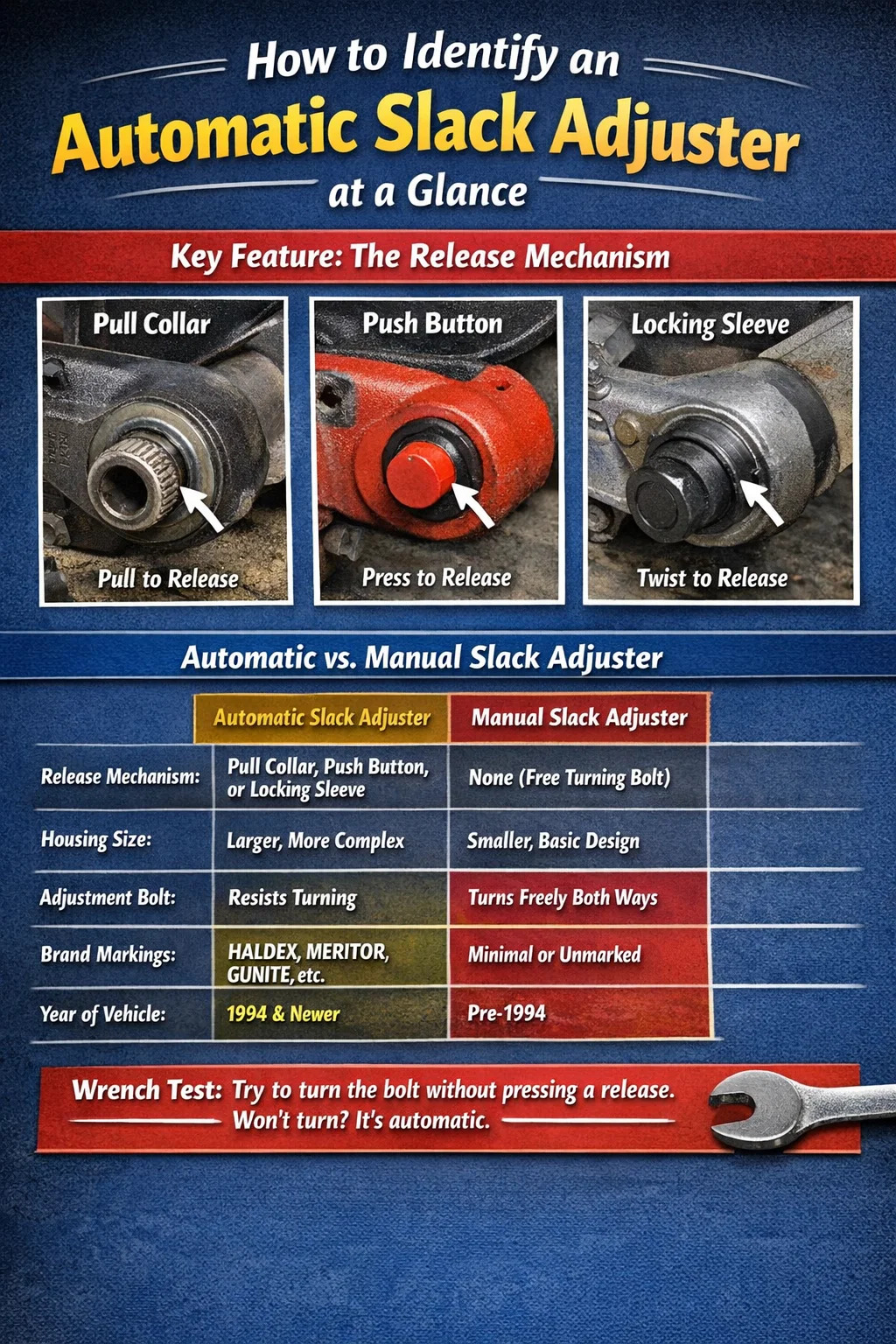 A placa do número de identificação do veículo (VIN) no batente da porta ou no exterior da cabine fornece a data de fabricação. Se o veículo foi construído depois de outubro de 1994 , a lei federal exige ajustadores automáticos de folga. Isto restringe consideravelmente a sua identificação - se for um caminhão pós-1994 e o ajustador não tiver um mecanismo de liberação óbvio, algo foi alterado ou mal instalado e precisa de mais investigação.