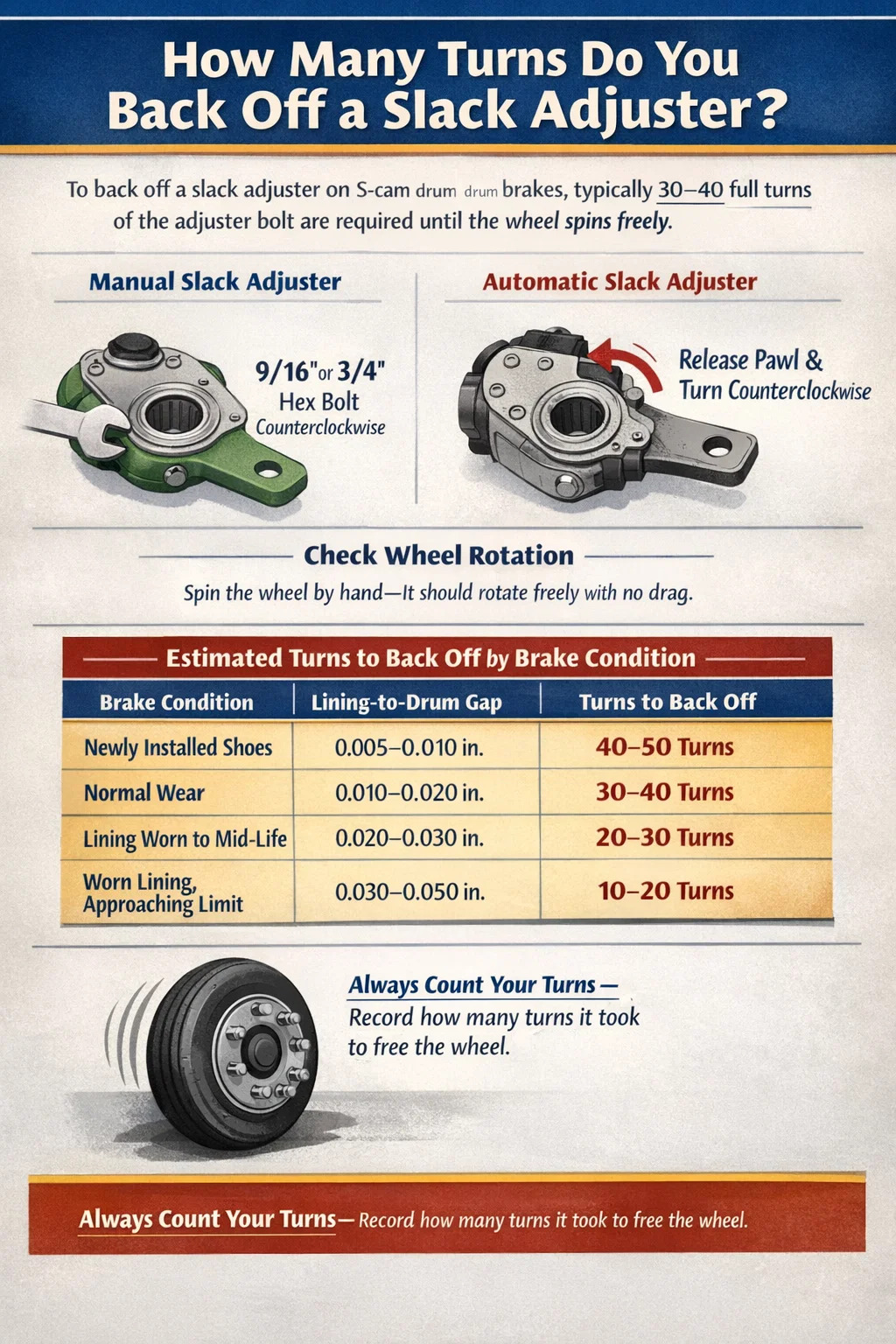 O número de voltas necessárias para recuar um ajustador de folga está diretamente relacionado à distância que o revestimento está atualmente do tambor. A tabela abaixo fornece estimativas práticas baseadas nas condições do revestimento: