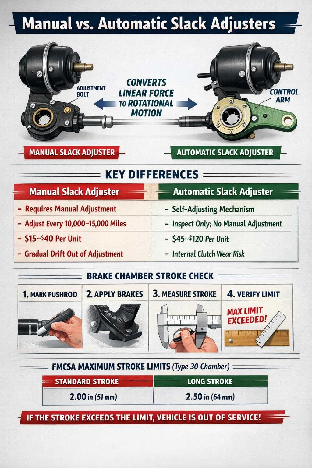 Do ponto de vista das operações da frota, um único pedido fora de serviço provoca perda de receita, detenção do motorista, custos de reboque, se aplicável, e uma marca na pontuação do SMS (Sistema de Medição de Segurança) da transportadora que afeta a classificação percentil do CSA por 24 meses. O custo de uma inspeção perdida do ajustador de folga excede rotineiramente US$ 2.000 a US$ 5.000 quando o impacto operacional total é calculado – muito mais do que o custo do próprio ajustador.