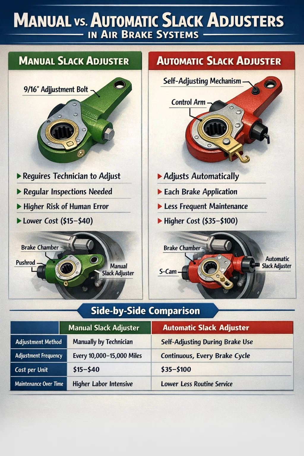 Compreender os dois tipos é importante, seja você um gerente de frota, um motorista comercial, um técnico de freios ou alguém que está estudando para um CDL. Os regulamentos federais sob FMCSA 393.47 estabelecem limites estritos para o deslocamento da haste, e a falha em uma inspeção devido a freios desajustados pode aterrar um veículo imediatamente. Saber como funciona cada tipo de ajustador de folga – e o que pode dar errado com cada um – mantém os veículos em conformidade, seguros e na estrada.